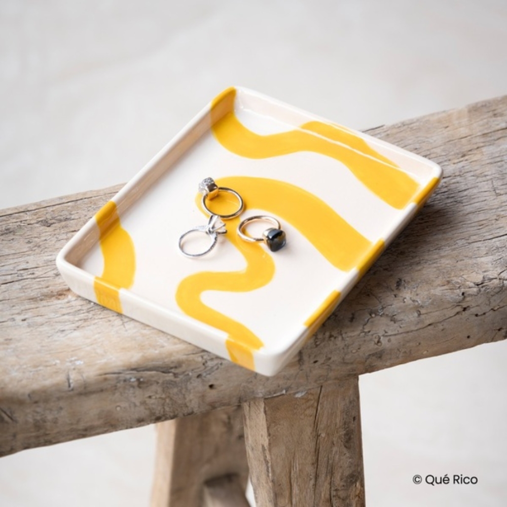 Χειροποίητος από τη βελγική μάρκα Que Rico, αυτός ο κίτρινος δίσκος θα προσθέσει μια ηλιόλουστη πινελιά στο σπίτι σας. – Δίσκος Que Rico Javier σε Ισπανικές Σπειροειδείς Γραμμές!
